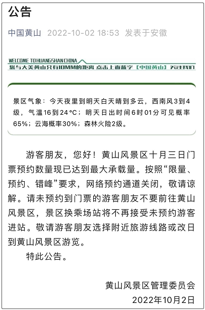 据了解,此前,“中国黄山”微信公众号在10月1日、2日均发布公告,提醒游客景区门票预约数量已达到最大承载量,按照限量、预约、错峰要求,停止预约。
