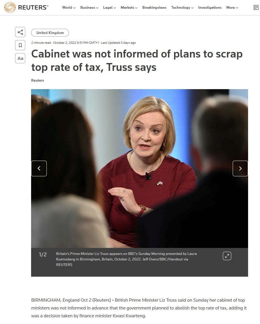 面对这样内外交困的形势,英国政府真的也“动起来了”。本来对自己的政策坚定不移的首相特拉斯,短短几天时间就变卦了——放弃此前提出的取消45%最高所得税税率的计划。路透社毫不客气地形容为“耻辱的180度转折”。