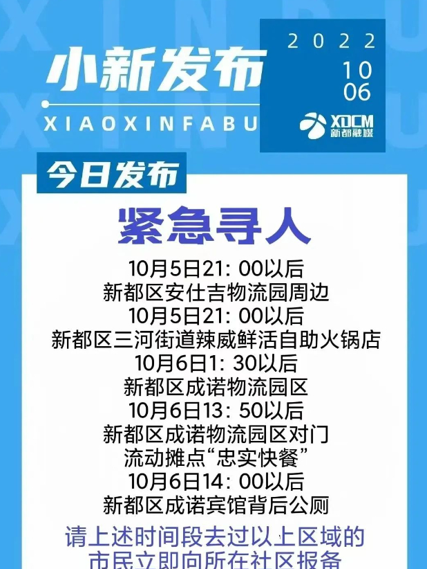 10月6—7日,成都新都区、成都新津区,乐山、宜宾、中江等地发布感染者、密接者最新活动轨迹,具体内容如下: