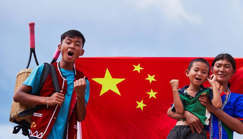 王发(左一)和弟弟、妈妈在国旗下的合影。
