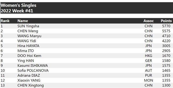 男单方面,樊振东、马龙、梁靖崑位列男单前三,王楚钦第11,林高远第12。女单方面,孙颖莎、陈梦、王曼昱、王艺迪排名前四位。日本选手早田希娜排名第五。陈幸同第13位。