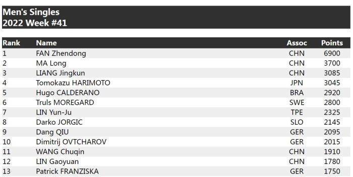 北京时间11日,国际乒联公布了最新一期世界排名。由于世乒赛团体赛不计入个人积分,本周排名较上周没有发生变化。