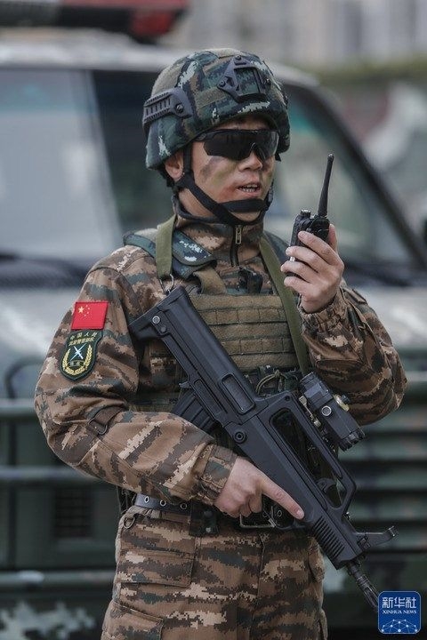 武警河北总队某部大队长李闯在演练中下达任务指令(2021年3月4日摄)。新华社发(张丹 摄)