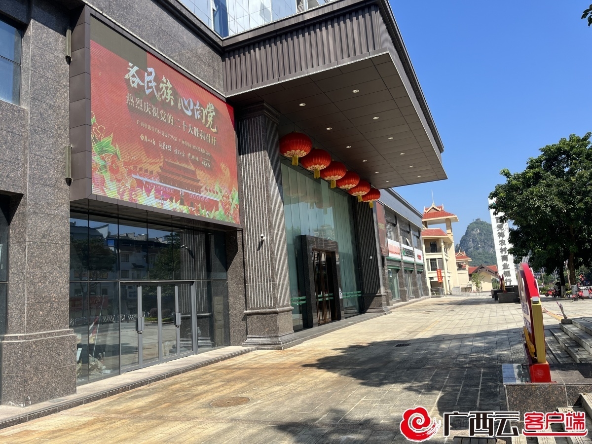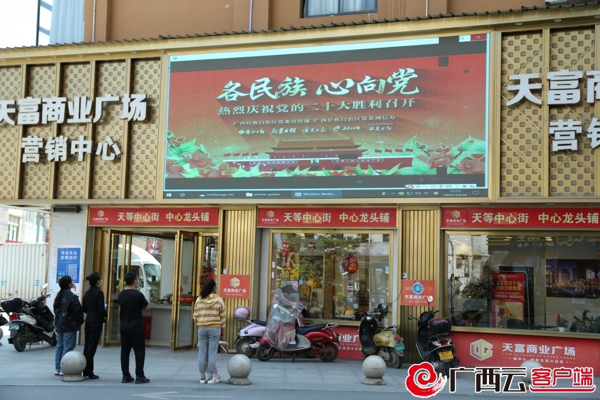 在崇左市天等县天富商业广场,几位市民驻足观看《各民族 心向党》短视频。