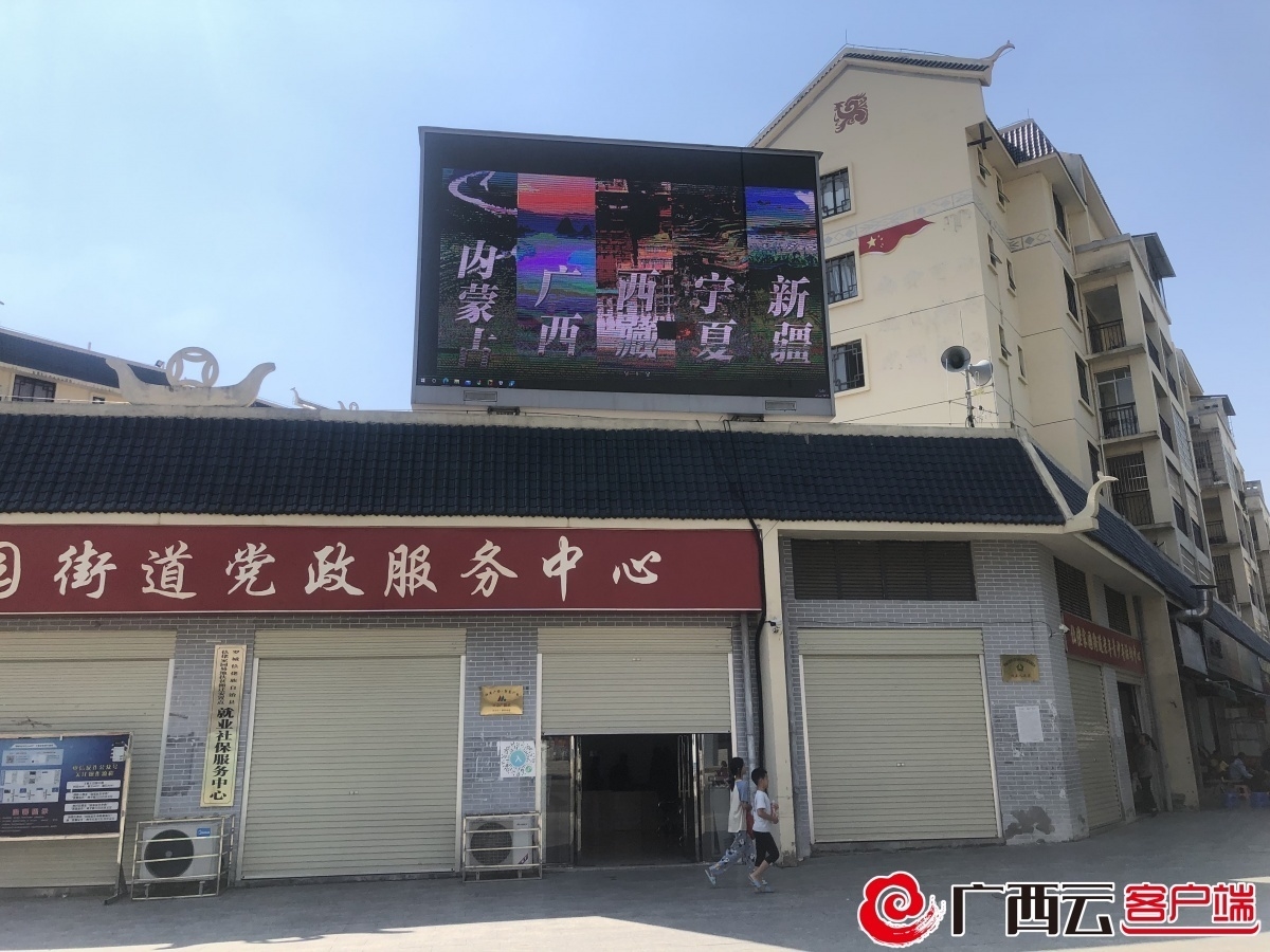 《各民族 心向党》短视频在河池市罗城仫佬族自治县易地扶贫搬迁点仫佬家园社区LED显示屏上播放。