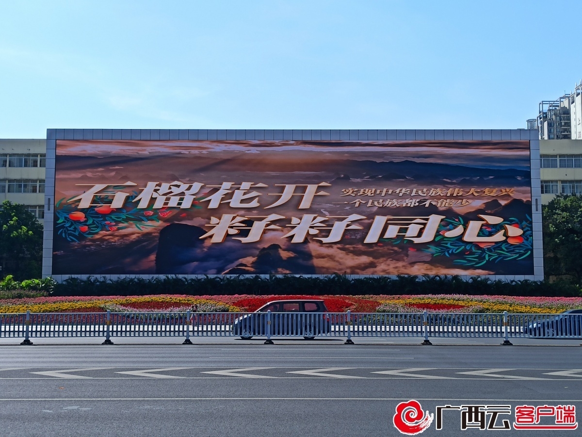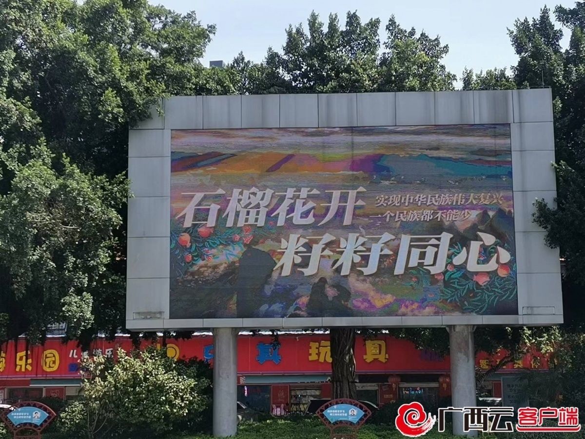 《各民族 心向党》短视频在南宁市民族广场LED显示屏上播放。
