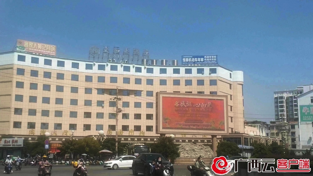 《各民族 心向党》短视频在凭祥市友谊关大道农村商业银行大楼LED显示屏上播放。
