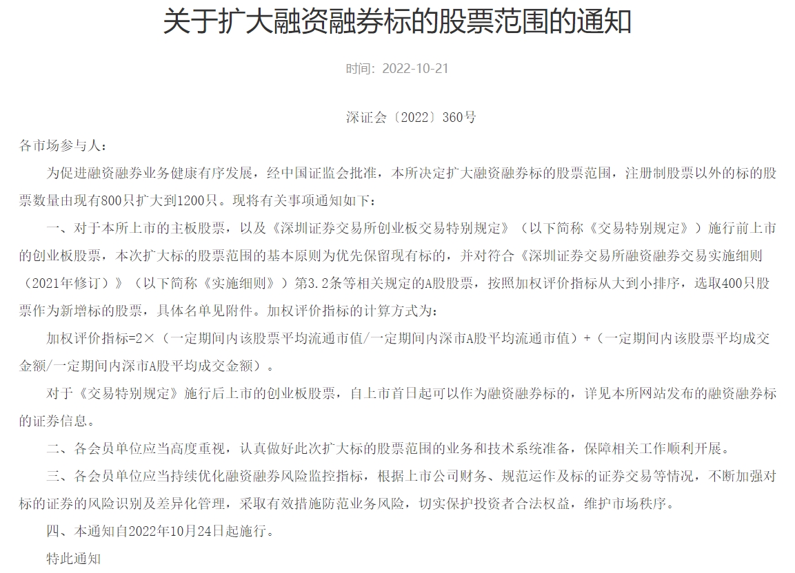10月21日,深交所发布通知称,为促进融资融券业务健康有序发展,经中国证监会批准,决定扩大融资融券标的股票范围,注册制股票以外的标的股票数量由现有800只扩大到1200只。通知自2022年10月24日起施行。
