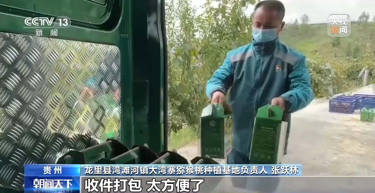 龙里县湾滩河镇大湾寨猕猴桃种植基地负责人 张跃林:村里有了快递服务店,很多时候快递小哥直接就在地头收件打包,太方便了。我们的收益还能提升3倍。