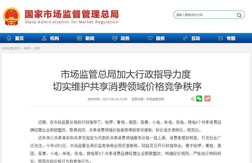 2021年6月,国家市场监督管理总局曾发布公告,要求遏制共享消费领域涨价。共享充电宝经整改后,2021年8月,各品牌租借平均价格为2.2~3.3元/小时,标价在每小时3元及以下的机柜占比69%~96%。