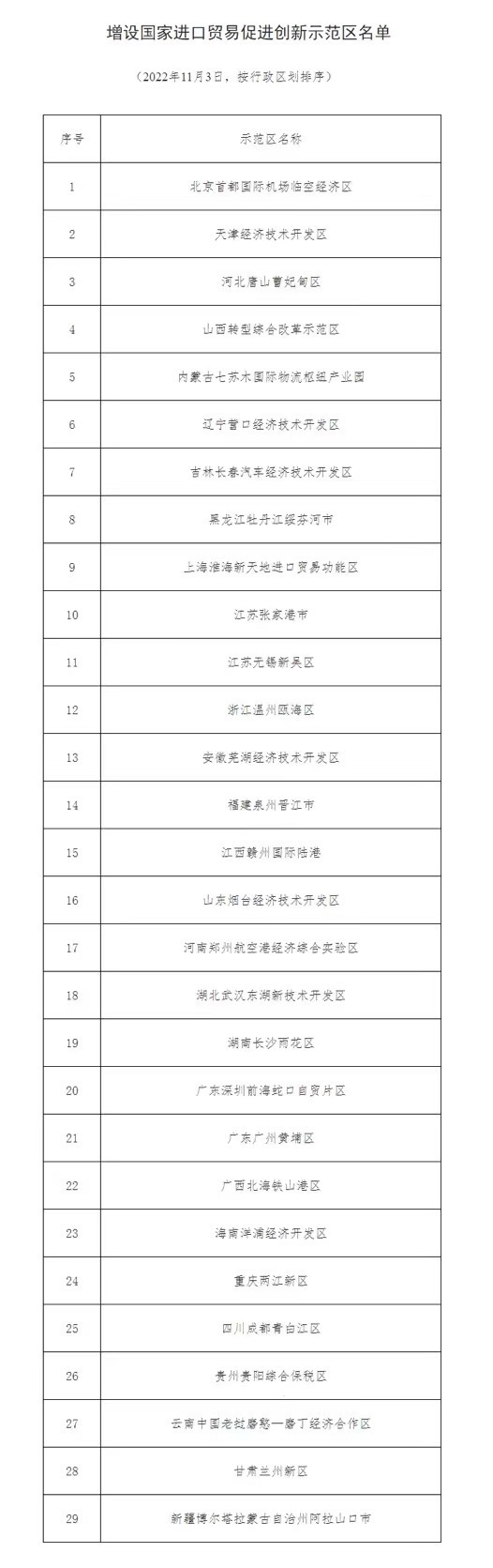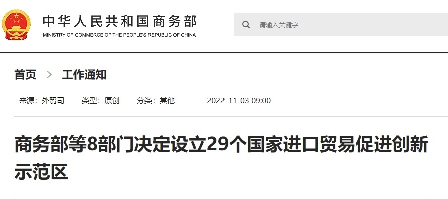 据商务部网站消息,11月3日,商务部、发展改革委、财政部、人民银行、海关总署、市场监管总局、外汇局、药监局决定,在全国增设29个国家进口贸易促进创新示范区。