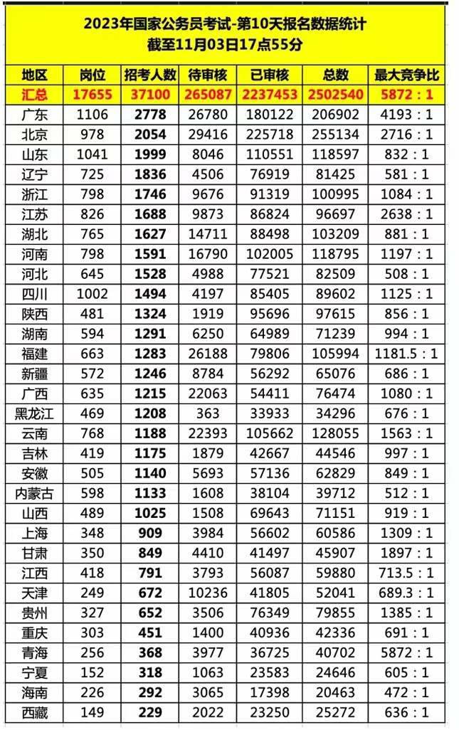 截至报名结束前五分钟,已有2237453人通过资格审核,相比前一天增长了将近60万人。各省数据当中,北京地区职位的报名人数达到255134人,位列榜首。广东省紧随其后,位列第二,报名人数达到206902人。云南省位列第三,报名人数达到128055。