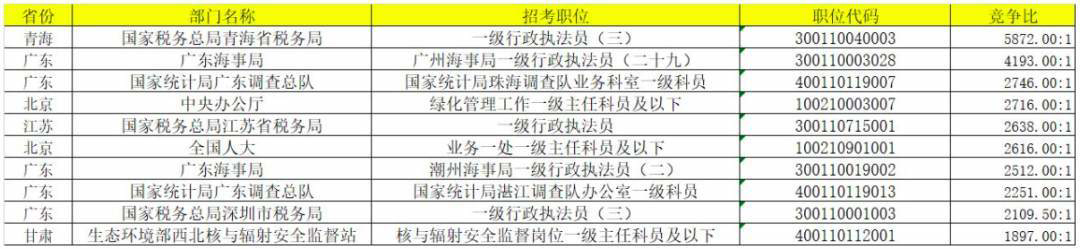 报名人数最多的职位为青海国家税务总局青海省税务局一级行政执法员(三),此职位仅招录1人,目前已经有5872个人过审。
