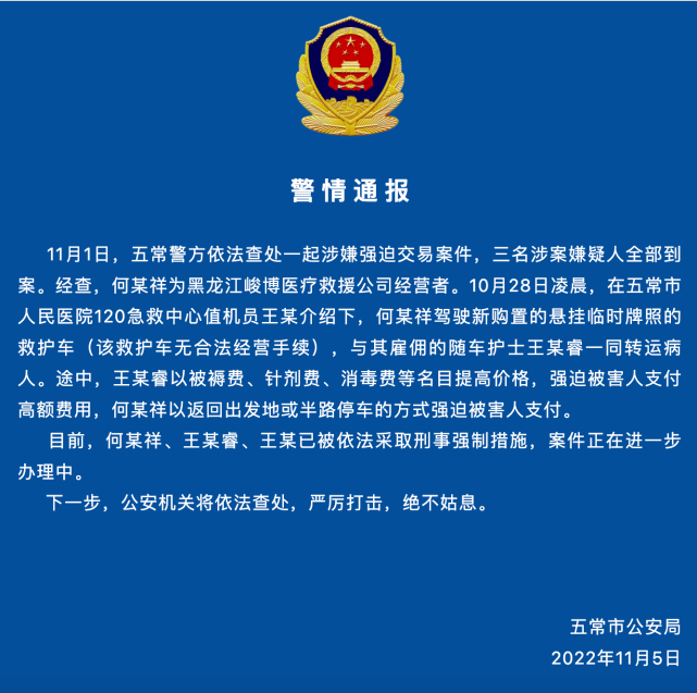 11月1日,五常警方依法查处一起涉嫌强迫交易案件,三名涉案嫌疑人全部到案。经查,何某祥为黑龙江峻博医疗救援公司经营者。10月28日凌晨,在五常市人民医院120急救中心值机员王某介绍下,何某祥驾驶新购置的悬挂临时牌照的救护车(该救护车无合法经营手续),与其雇佣的随车护士王某睿一同转运病人。途中,王某睿以被褥费、针剂费、消毒费等名目提高价格,强迫被害人支付高额费用,何某祥以返回出发地或半路停车的方式强迫被害人支付。
