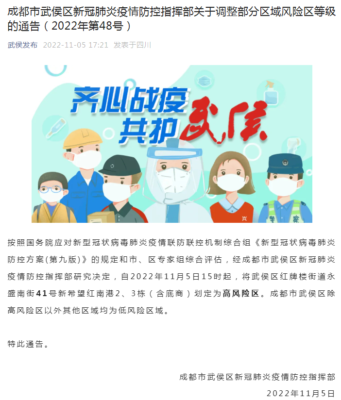 据成都市武侯区新冠肺炎疫情防控指挥部11月5日消息,按照国务院应对新型冠状病毒肺炎疫情联防联控机制综合组《新型冠状病毒肺炎防控方案(第九版)》的规定和市、区专家组综合评估,经成都市武侯区新冠肺炎疫情防控指挥部研究决定,自2022年11月5日15时起,将武侯区红牌楼街道永盛南街41号新希望红南港2、3栋(含底商)划定为高风险区。成都市武侯区除高风险区以外其他区域均为低风险区域。