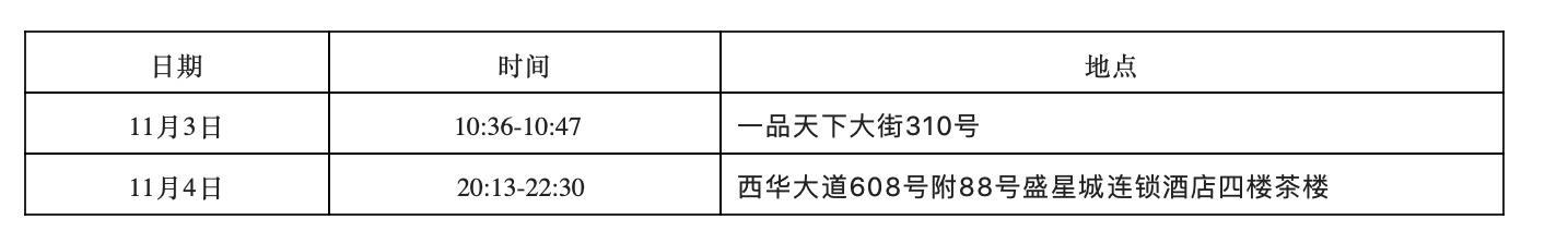 各位市民朋友,如与以下活动轨迹有重叠,请立即向社区和单位(或居住的酒店)报备,三天内接受三次核酸检测(间隔24小时),期间做好个人防护,不聚会、不聚餐。