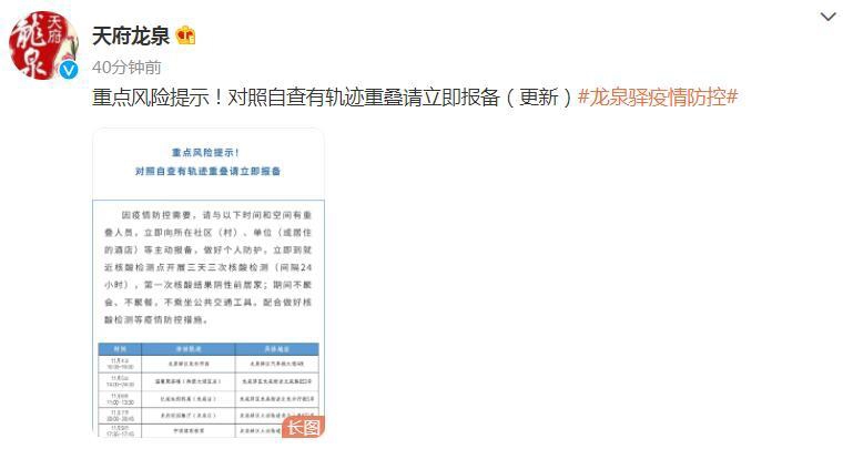 11月10日下午,据@天府龙泉消息,成都龙泉驿区发布重点风险提示,对照自查有轨迹重叠请立即报备。