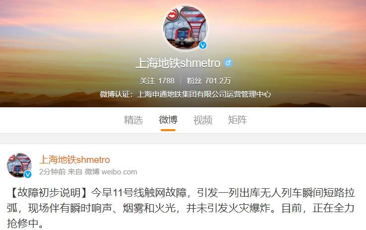 据“上海地铁shmetro”消息,今早11号线触网故障,引发一列出库无人列车瞬间短路拉弧,现场伴有瞬时响声、烟雾和火光,并未引发火灾爆炸。目前,正在全力抢修中。