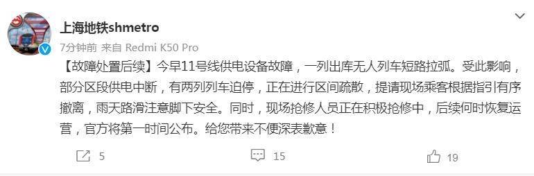 据@上海地铁shmetro消息,今早11号线供电设备故障,一列出库无人列车短路拉弧。受此影响,部分区段供电中断,有两列列车迫停,正在进行区间疏散,提请现场乘客根据指引有序撤离,雨天路滑注意脚下安全。同时,现场抢修人员正在积极抢修中,后续何时恢复运营,官方将第一时间公布。给您带来不便深表歉意!