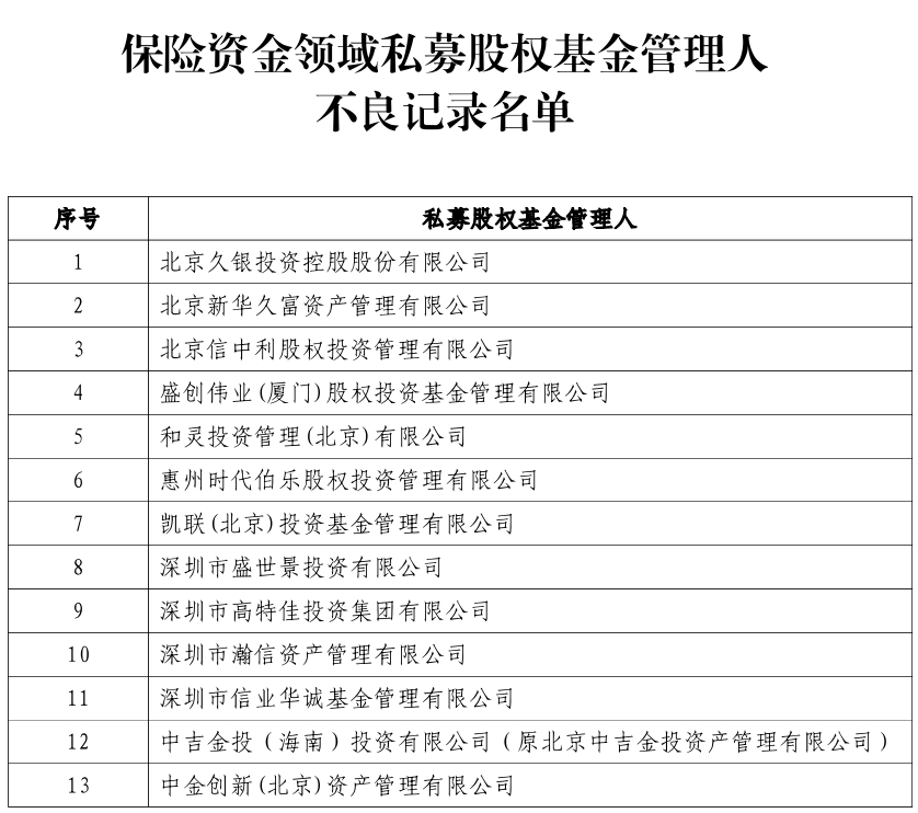 根据通报,被列入不良记录名单的私募股权基金管理人共有13家。通报要求,各保险机构依据相关规定和程序,停止与名单中私募股权基金管理人的投资合作,不得与其发生任何业务往来,审慎与其核心管理人员开展任何业务往来。