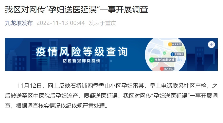 11月12日,网上反映石桥铺四季香山小区孕妇雷某,早上电话联系社区产检,之后被送至区中医院后孕妇流产,质疑送医延误。我区对网传“孕妇送医延误”一事开展调查,根据调查核实情况依纪依规严肃处理。