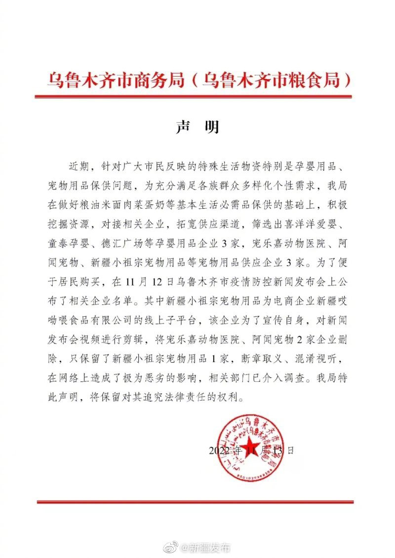 乌鲁木齐市商务局关于11月12日乌鲁木齐市疫情防控新闻发布会相关视频的声明↓↓↓