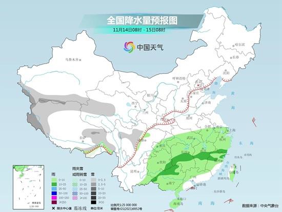 未来三天(11月14日至16日),江南、华南以及重庆、贵州等地降雨有所增多,强度也将加强,同时气温继续下跌,将回落至正常水平附近或较常年同期短暂偏低的状态,而在北方大部则将在晴朗中迎来升温。