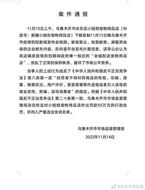 刻意删剪防疫发布会视频做宣传,乌鲁木齐一宠物店被罚50万