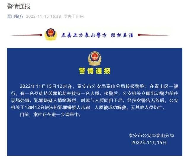 2022年11月15日12时许,泰安市公安局泰山分局接报警称:在泰山区一银行,有一名歹徒持凶器抢劫并挟持一名人质。接警后,公安机关立即出动警力前往现场处置。犯罪嫌疑人情绪激烈,叫嚣与人质同归于尽。经多次警告无效后,公安机关于13时12分依法将犯罪嫌疑人击毙,人质被成功解救,无其他人员伤亡。
