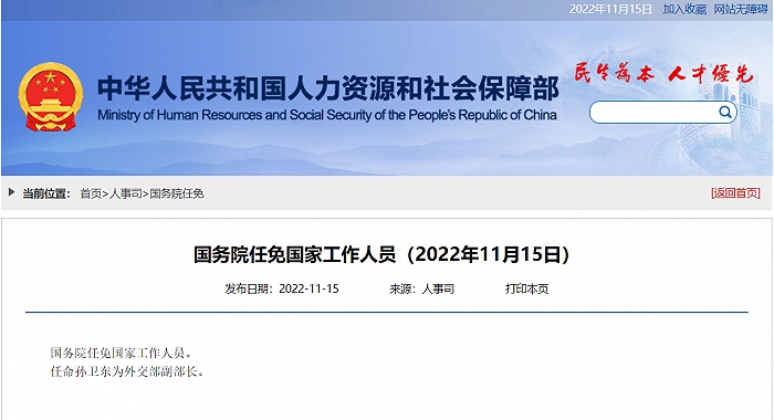 人社部网站11月15日消息,国务院任免国家工作人员,任命孙卫东为外交部副部长。