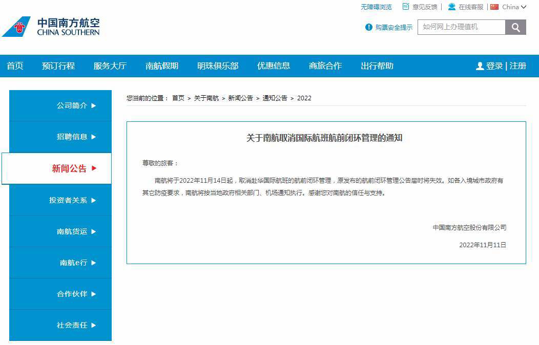 中国南方航空发布《关于南航取消国际航班航前闭环管理的通知》: