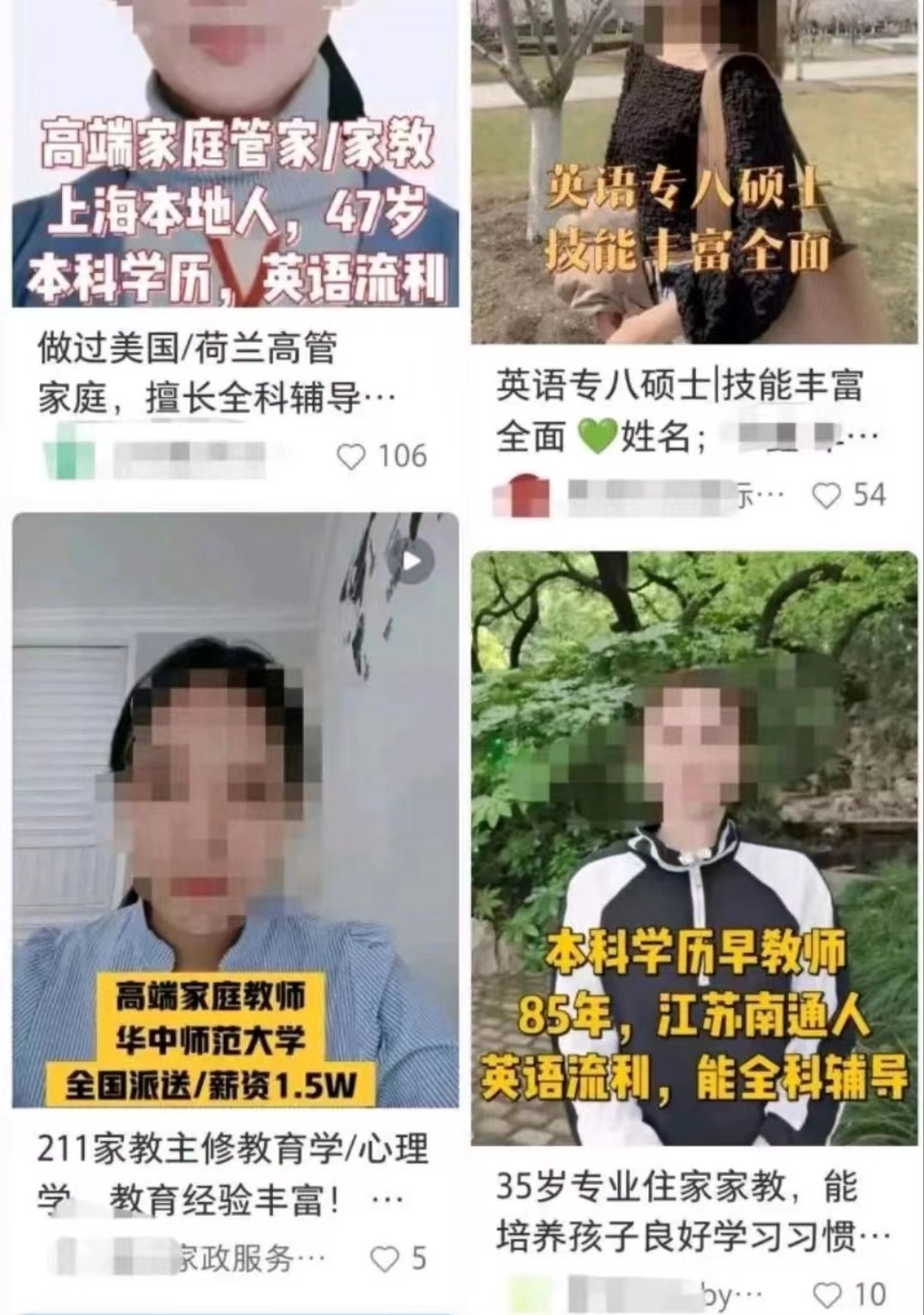 本硕学历均毕业于名校,年龄在20岁至30岁之间,精通两三门语言,考取了各种证书,部分人还是海归……这不是互联网大厂在显摆员工队伍,而是一些社交平台上发布的家政服务人员的信息。家政行业已经那么“卷”了吗?据法治日报报道,她们中大多数是在“高学历家政阿姨”的头衔下,做着教辅的工作。以“家政”、“成长陪伴师”等对外宣传,主要任务还是辅导孩子功课。之所以“卷入”家政,是为了避免被封禁查处。