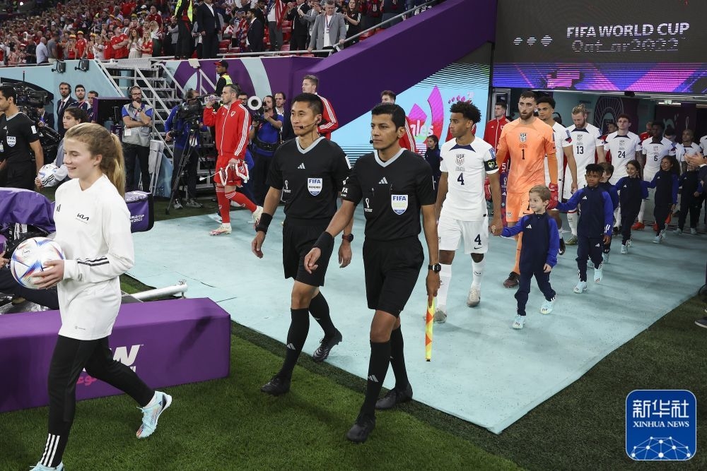↑中国裁判员马中国裁判员马宁(中)在出场仪式上。新华社记者 潘昱龙 摄