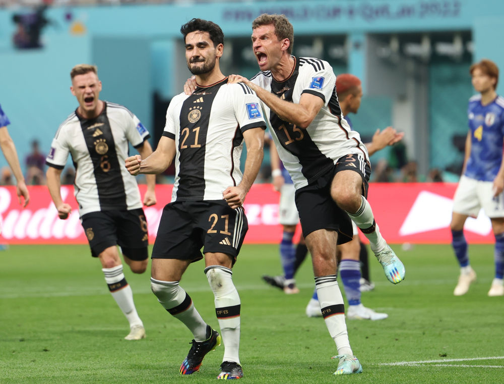 11月23日,德国队球员伊尔凯·京多安(中)主罚点球命中后庆祝。新华社记者 潘昱龙 摄