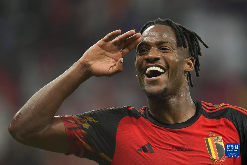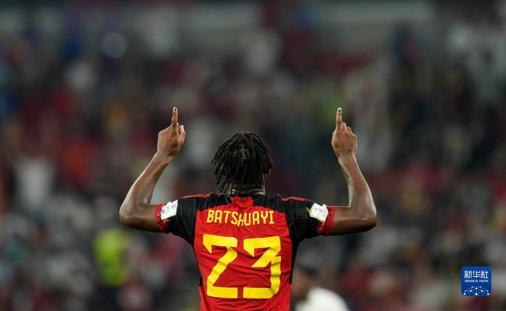 11月23日,比利时队球员巴舒亚伊在比赛中进球后庆祝。新华社记者 孟鼎博 摄