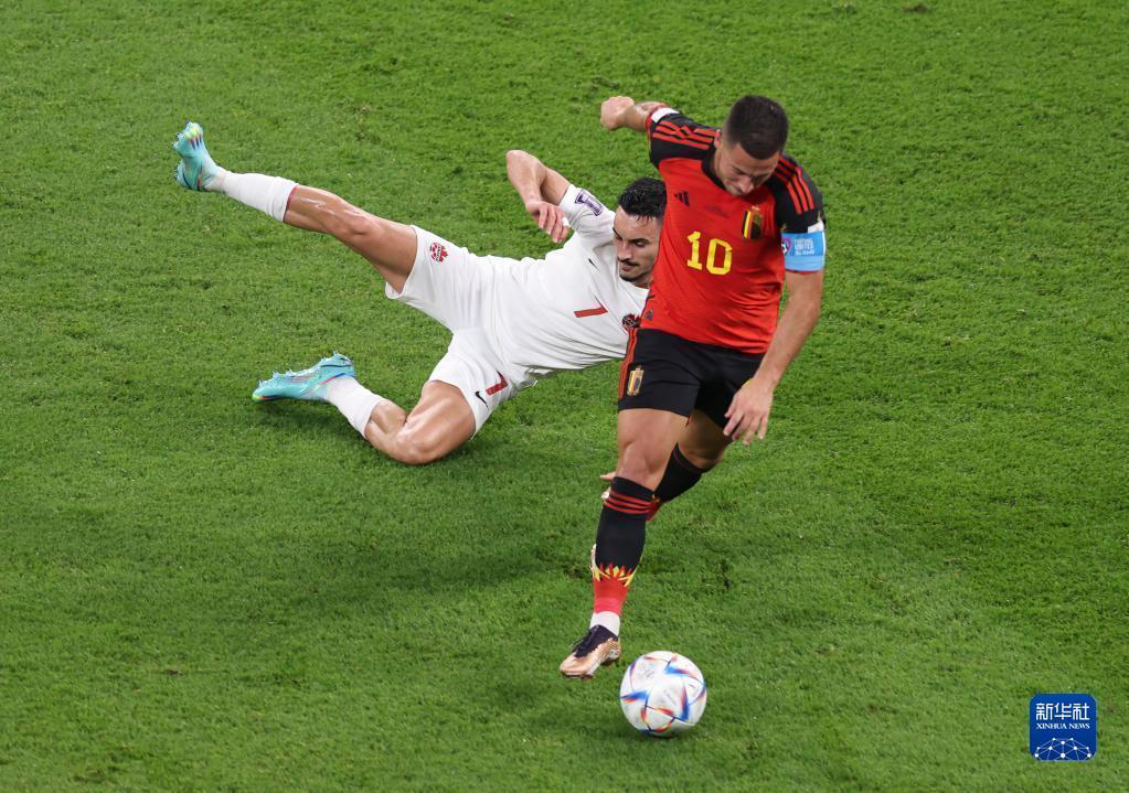 11月23日,比利时队球员卡拉斯科(前左)在比赛中拼抢。新华社记者 孟鼎博 摄