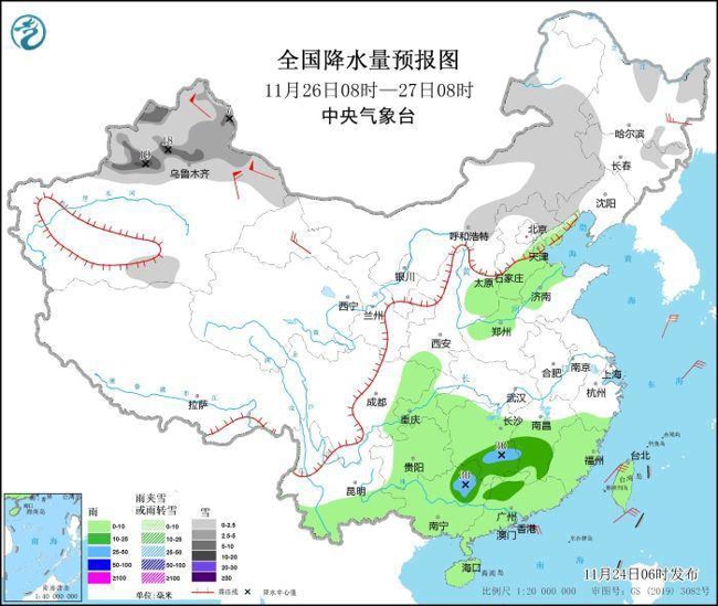 图2 全国降水量预报图(11月25日08时-26日08时)