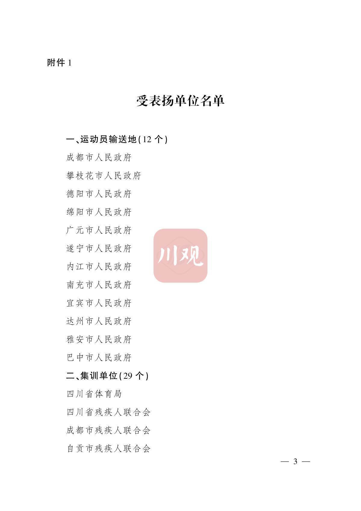在全国第十一届残疾人运动会暨第八届特殊奥林匹克运动会上,四川体育代表团共夺得71枚金牌、74枚银牌、60枚铜牌,竞技项目金牌数和奖牌数继续位列全国第一方阵,群众体育项目金牌数和奖牌数位列全国第二位,实现了运动成绩和精神文明双丰收。我省残疾人运动员以自强不息、奋勇争先的精神品质和良好竞技水平,为家乡和人民赢得了荣誉。为肯定成绩,激励先进,进一步推动全省残疾人体育事业高质量发展,省政府决定,对在全国第十一届残疾人运动会暨第八届特殊奥林匹克运动会上为我省获得优异成绩作出突出贡献的单位和个人进行通报表扬。