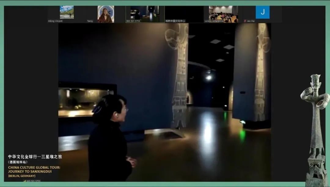 活动一开始,柏林的中学生通过观看《三星堆—再现失落的文明》和《奇遇三星堆Adventure in Sanxingdui》两支短片,了解了三星堆文明传承,领略到中华文化魅力。随后,四川国际传播中心双语主播林嘉薇和三星堆博物馆讲解员王鸣婕通过“直播连线”的方式,带领德国柏林的学生们“亲临”三星堆博物馆现场。