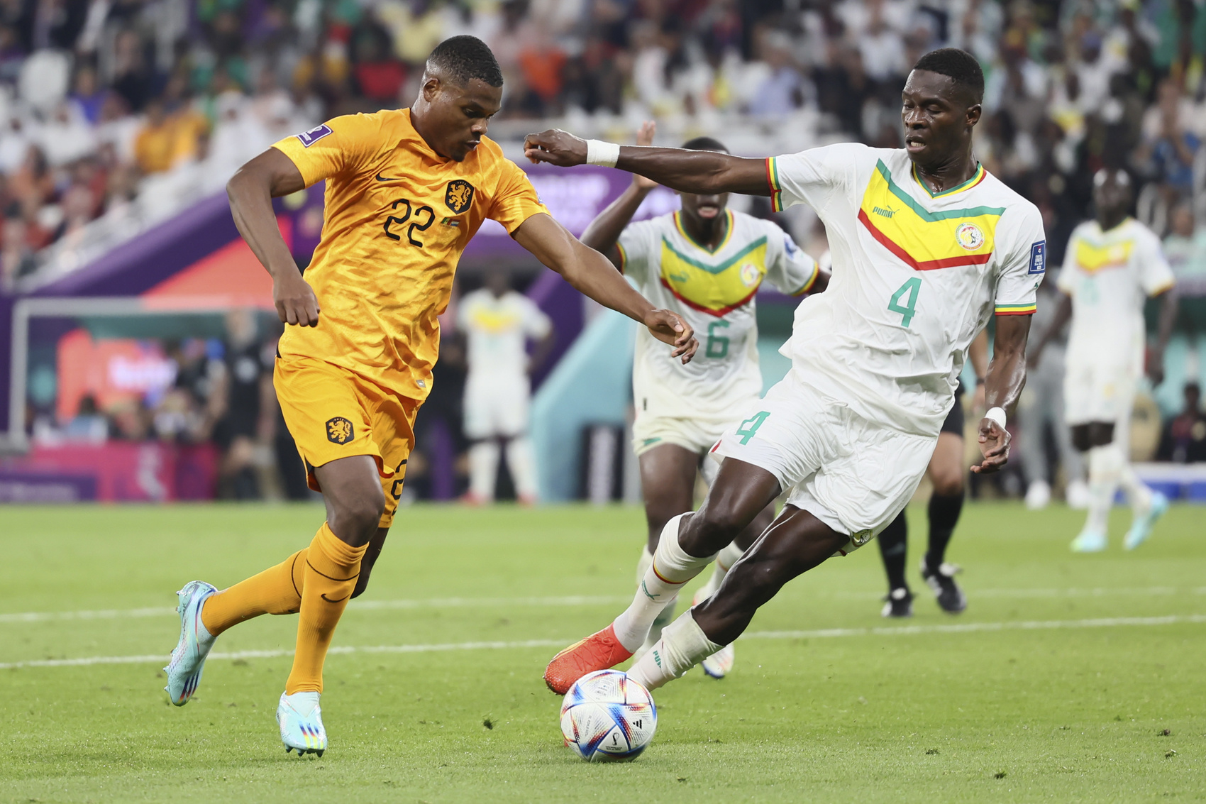11月21日,荷兰队球员丹泽尔·邓弗里斯(左)与塞内加尔队球员帕佩·西塞在比赛中拼抢。新华社记者兰红光摄
