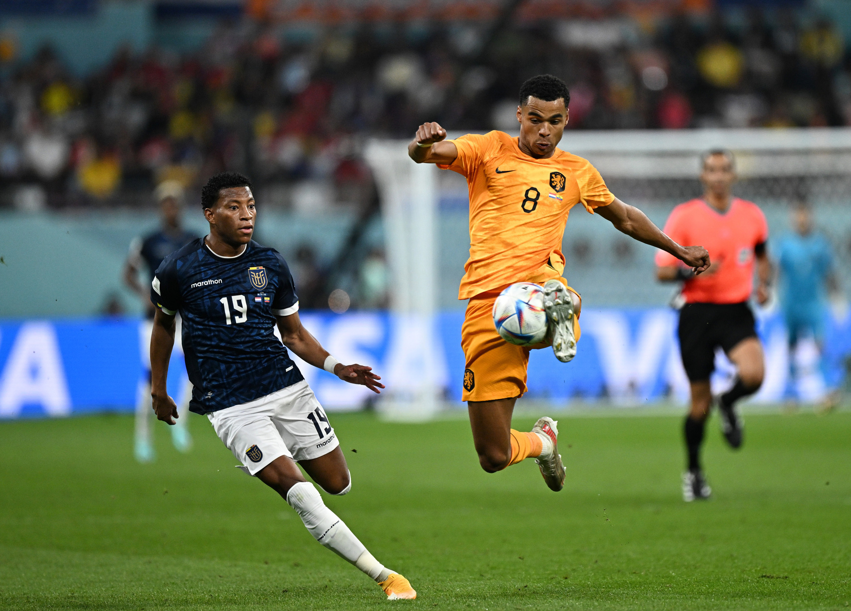 11月25日,荷兰队球员科迪·加克波(右)在对阵厄瓜多尔队的比赛中拼抢。新华社记者辛悦卫摄