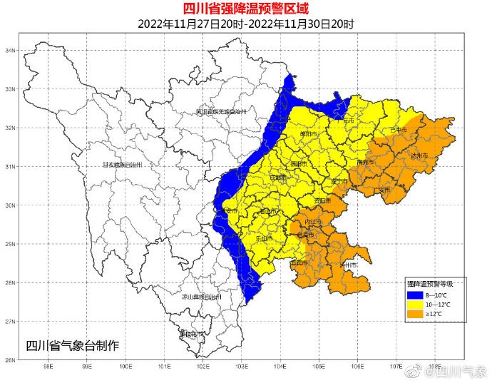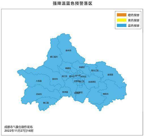 成都市气象台2022年11月27日16时00分发布强降温蓝色预警: