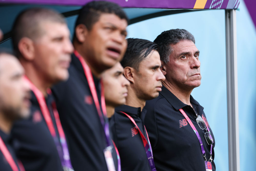 11月27日,在2022卡塔尔世界杯足球赛E组比赛中,日本队对阵哥斯达黎加队。图为哥斯达黎加队主教练苏亚雷斯(右一)在赛前奏国歌仪式上。新华社记者贾浩成摄