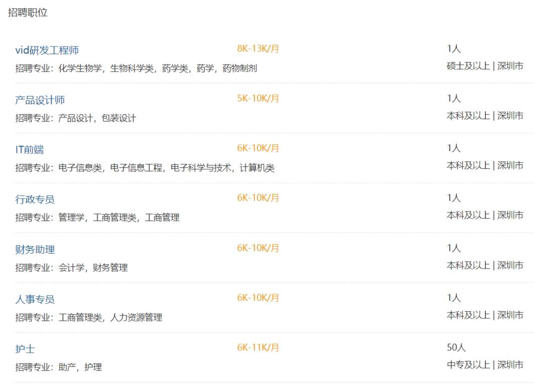 澎湃新闻从公司发布的一则校园招聘上看到,公司招聘的职位包括vid研发工程师,产品设计师,以及人数最多的护士等。其中薪资最高的为月薪8千-1.3万元的vid研发工程师,主要工作职责是“负责核酸提取试剂盒开发、升级和优化”。招聘人数最多的护士岗位,主要工作职责则是在深圳各市区做核酸采样工作。