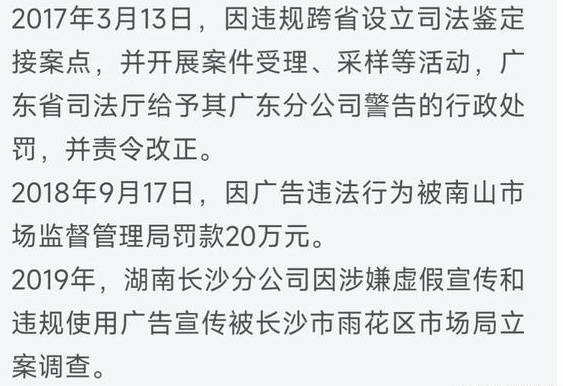 公司创立之初,主营业务是司法鉴定和天赋基因检测,不过当时做的并不顺利,这两项业务都曾经违规被处罚,甚至被当时的湖南卫视打假。