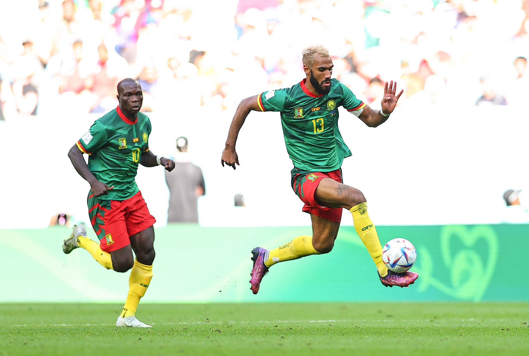 11月28日,喀麦隆队球员舒波-莫廷(右)与队友阿布巴卡尔在比赛中。新华社记者丁旭摄