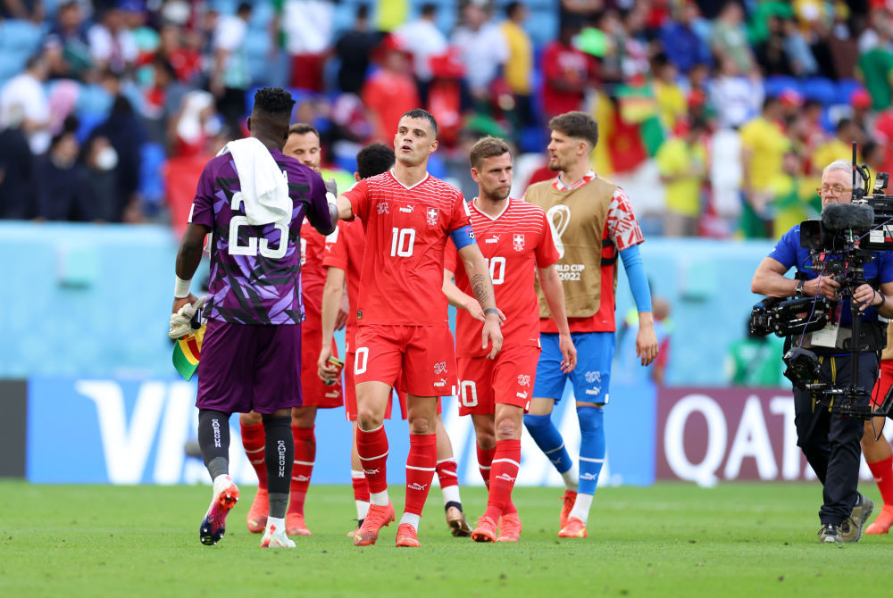 11月24日,瑞士队球员扎卡(10号)在赛后向喀麦隆队守门员奥纳纳致意。新华社记者李明摄