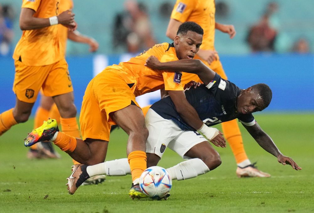 11月25日,荷兰队球员廷贝尔(前左)与厄瓜多尔队球员门德斯在比赛中拼抢。新华社记者孟永民摄