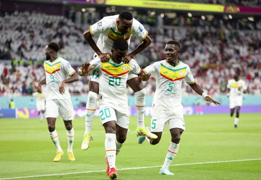 11月25日,塞内加尔队球员迪昂(前,20号)在进球后与队友萨尔、格耶(右)庆祝。新华社记者韩岩摄