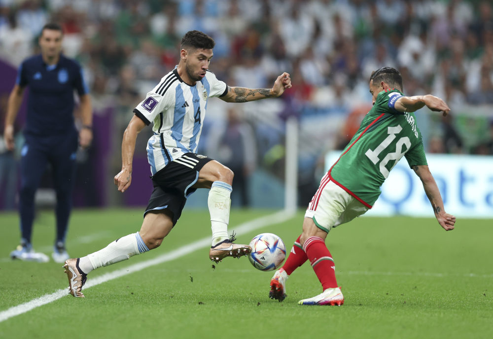 11月26日,阿根廷队球员蒙铁尔(左)在比赛中与墨西哥队球员安德烈斯·瓜尔达多拼抢。新华社记者潘昱龙摄